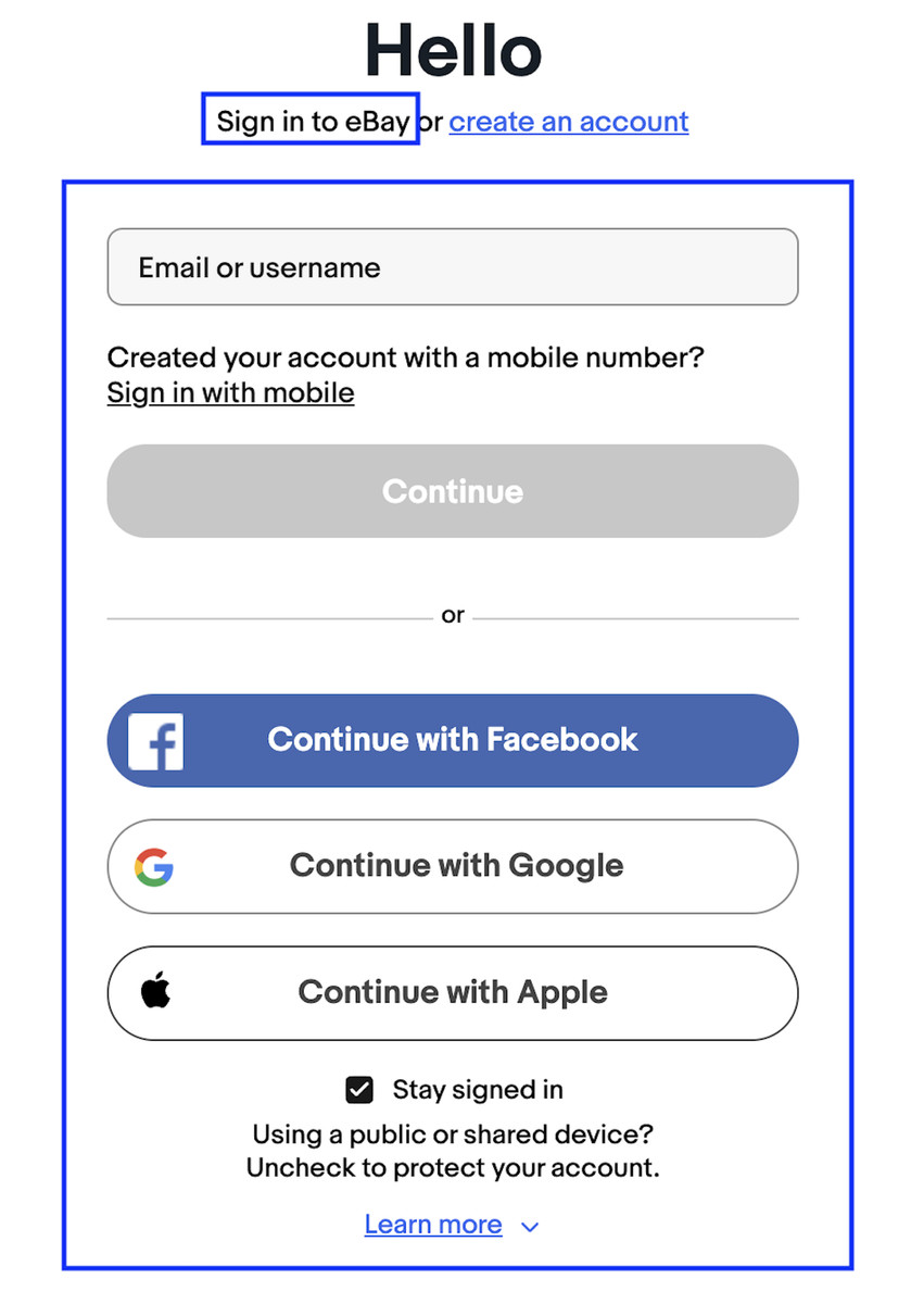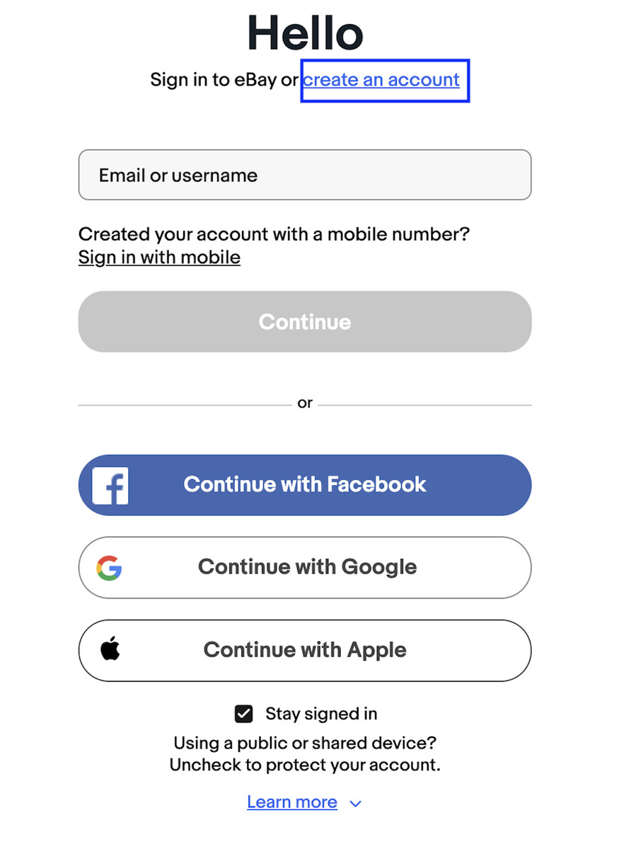 Step 3: On this Hello page, you will have the option of 'Sign into ebay' or 'create an account'.