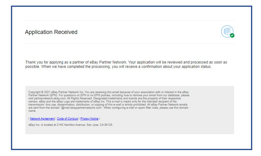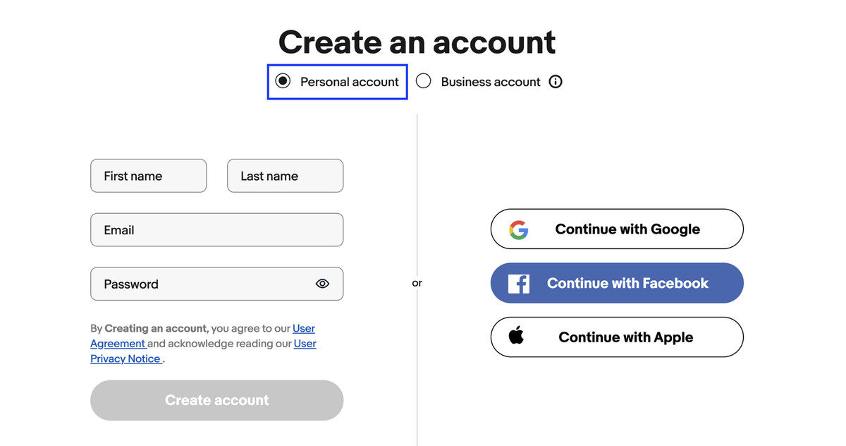 Fill out the name fields with the email address you would like to use to for ePN registration. Then, click the ‘Create account’ button at the bottom of the fields. Or, you may also use your email address that is linked to your Facebook, Google, or Apple domain, by clicking on the corresponding button.