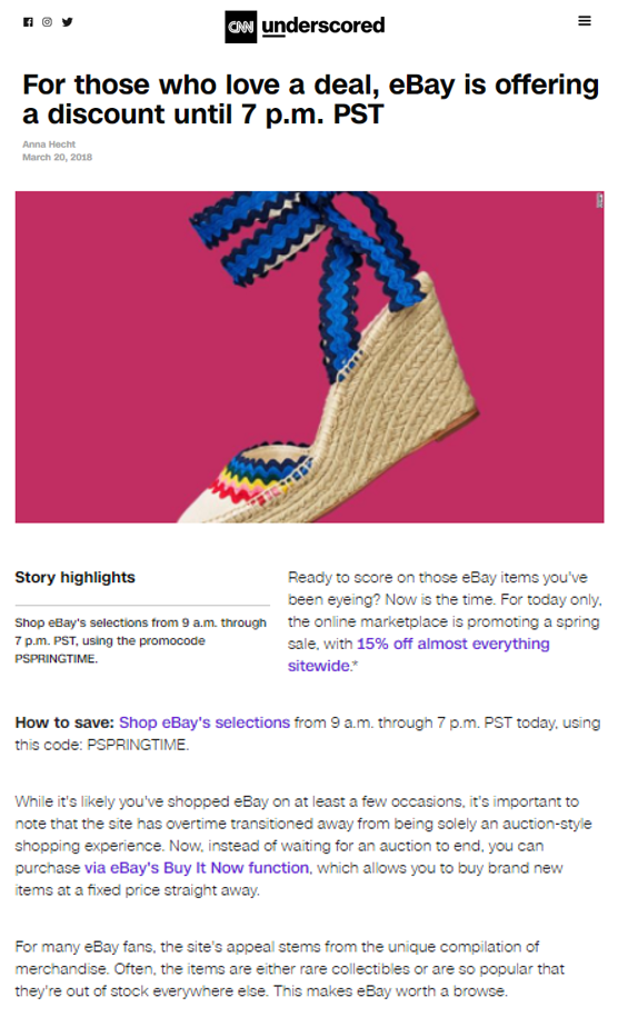 CNN leveraged its Underscored channel -- an online shopping guide for the best in style, tech, health, and travel -- to drive sales with a 15% off sitewide flash coupon.